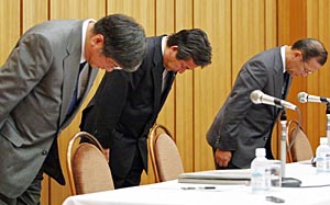 | 25日,三洋電機公司總裁佐野精一郎(中)與公司其他管理人員出席在日本大阪舉行的新聞發布會。新華社/法新 | 東京證券交易所25日說,三洋電機公司誤報6年財務數據,將可能面臨摘牌危險。三洋公司在連續3年虧損后剛剛出現盈利,此次遭遇摘牌危機,三洋將可能被迫繼續其重組進程。 東京證交所當天在自己網站上發表聲明說,已將三洋公司股票移至監控板塊,證交所計劃展開審查,決定是否將其摘牌。聲明說:“三洋公司修改業績報表數據的做法非同尋常。證交所將展開進一步審查……三洋公司可能被摘牌! 日本信近資產管理公司首席基金管理人藤遠直紀(音譯)說,三洋如果遭摘牌,將被迫繼續重組。 2006年,高盛公司、大和證券和住友三井金融集團曾聯合向三洋公司注資26億美元,將三洋公司拖出破產邊緣。同時,身為創業者的三洋公司原董事長井植敏雅和父親井植敏辭職,三洋公司開始金融機構主導下的重組與再建。 為探索新的發展方向,三洋公司先后出售平板顯示器合資企業,以及一家在泰國的冰箱制造企業,同時投巨資生產可充電電池。 三洋公司總裁佐野精一郎25日承諾,不會再犯同樣錯誤。佐野精一郎當天在新聞發布會上說:“我們非常重視修改業績報表一事,三洋公司將建立一套體系,防止這種錯誤再次發生! 三洋公司表示,修改業績數據是因為低估了半導體、液晶顯示器部門的虧損。 總部位于大阪的三洋公司25日說,自2001財政年度至2006財政年度,公司凈虧損4845億日元(約合42.4億美元),高于先前公布的4786億日元(約合41.5億美元)。 三洋公司同時宣布,將削減行政人員薪水,停止向董事會成員發放退休金。三洋決定,扣發16名前董事會成員與13名現董事會成員的退休金;將公司總裁和執行副總裁6個月工資削減60%,其他一些高級職員也將被削減工資。 日本證券交易監視委員會建議對三洋公司處以830萬日元(約合7.265萬美元)罰款。三洋公司股價25日下跌3.6%。 在連續3年虧損后,三洋公司2007財年上半年度剛剛出現盈利。 (新華社專稿)