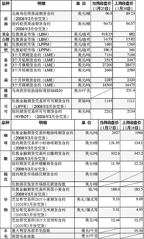 最近,南非全國出現缺電危機,致使南非黃金和鉑金生產連續幾天處于癱瘓狀態。南非政府25日宣布,目前嚴重的電力短缺為“國家緊急狀況”,并警告短期內還不能緩解缺電危機,貴金屬價格因而走高。 倫敦市場鉑價在25日升至每盎司1701美元的歷史最高點,黃金價格躍至每盎司923.73美元的歷史最高紀錄,白銀價格也增至27年來的最高點——每盎司16.61美元。受投資者擔心美國經濟出現衰退影響,基本金屬價格漲跌不一。 國際原油市場上,投資者擔心,美國經濟增速放緩甚至陷入衰退可能對全球原油需求產生抑制作用,而當周初發生的全球股市暴跌更加劇了投資者的這種擔憂。美聯儲22日決定緊急降息0.75個百分點,將聯邦基金利率即商業銀行間隔夜拆借利率從4.25%降至3.50%,以防止美國經濟陷入衰退,同時也是為了恢復投資者信心,從而避免金融市場進一步動蕩,但交易商懷疑放寬貨幣政策能否真正使美國經濟避免走上衰退道路,這導致當周前幾個交易日國際油價下滑。 此后,受美國國會和政府就一項經濟刺激計劃達成一致消息的影響,當周國際油價又出現反彈。美國國會和政府24日宣布,雙方已就一項大規模經濟刺激計劃達成一致。分析人士指出,該消息有助于緩解交易者對美國經濟可能陷入衰退進而導致其原油需求下降的擔憂,這是推動油價上漲的主要因素。不過,由于降息將使美元進一步走軟,將促使石油投機商今年秋季和冬季進入石油市場,可能推動油價再次突破每桶100美元大關。 因擔心可可主產國科特迪瓦出現供給困難,紐約和倫敦兩個市場的可可價格反彈;糖價則結束了連續6周的上漲行情開始下滑。