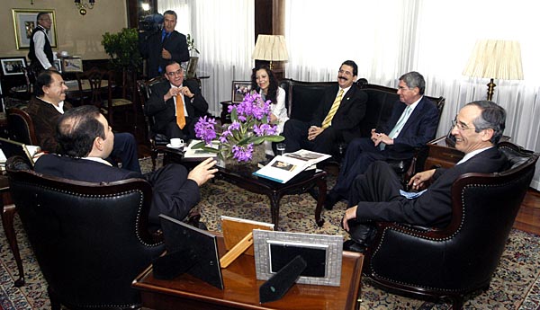 12日,在哥斯達黎加首都圣何塞,哥斯達黎加總統阿里亞斯(右二)、尼加拉瓜總統奧爾特加(左一)、洪都拉斯總統塞拉亞(右三)、薩爾瓦多總統薩卡(左前)和危地馬拉總統科洛姆(右一)參加工作會談。當天,中美洲5國總統在圣何塞發表聲明,要求歐盟在未來與中美洲的雙邊伙伴關系協定談判中建立一套“真正的自由貿易體系”,使雙邊貿易“更加公正”。