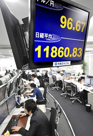 由于投資者預期美聯儲即將降息,近來美元對多數西方其他主要貨幣比價持續下跌,17日東京外匯市場早盤歐元兌美元一度升至1比1.5905,為歷史最高紀錄。同時,美元兌日元比價一度跌至1比95.75,是1995年9月以來新低。午盤后,日元多頭獲利回吐,美元兌日元尾盤企穩于1比97.3。 受此影響,14日紐約股市三大股指曾全部下跌,且跌幅皆超過1.5%,其中道瓊斯指數下跌近200點。17日,東京股市日經225股指受日元急劇升值影響大幅下挫454點,大盤一度跌穿11700點。其后,受匯市日元升勢趨緩等因素影響,盤面跌勢有所緩和,日經股指小幅反彈,最終以11787.51點報收,跌幅為3.71%。 |