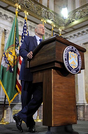 | 3月31日,美國財政部長亨利·保爾森在新聞發布會上發表講話。新華社記者