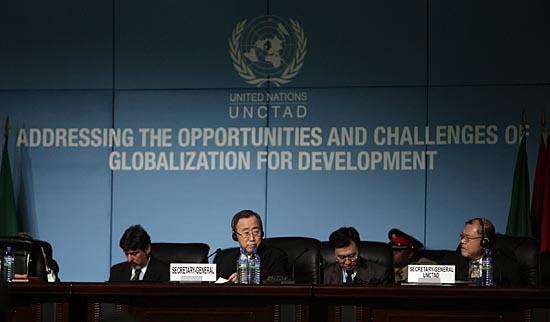 | 20日,聯合國秘書長潘基文(中)出席在加納首都阿克拉舉行的第12屆聯合國貿易和發展大會開幕式。新華社/法新 |