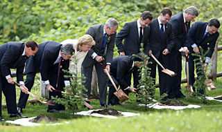 | 8日,意大利總理貝盧斯科尼、英國首相布朗、德國總理默克爾、美國總統布什、日本首相福田康夫、法國總統薩科齊、俄羅斯總統梅德韋杰夫、加拿大總理哈珀和歐盟委員會主席巴羅佐(從左至右)在植樹典禮上。當天,在日本洞爺湖出席八國峰會的領導人在峰會主會場溫莎飯店參加了一個植樹典禮。新華社/路透 | 舉世關注的八國集團首腦會議9日在日本洞爺湖閉幕。 這次八國集團首腦會議包括四個主要會議,即美國、英國、法國、德國、意大利、加拿大、俄羅斯和日本八國首腦同阿爾及利亞、埃塞俄比亞、加納、尼日利亞、塞內加爾、南非、坦桑尼亞七個非洲國家領導人舉行的對話會、八國首腦獨自舉行的工作會議、八國首腦同中國、巴西、印度、南非、墨西哥五個發展中國家領導人對話會以及主要經濟大國能源和氣候變化會議。 在三天的會期內,與會者討論了氣候變化、世界經濟、能源和糧食安全、貿易、金融體系發展、非洲發展以及國際安全領域的一些問題。盡管與會者就當前世界面臨的一些主要問題達成了一定共識,但并沒有取得多少突破。