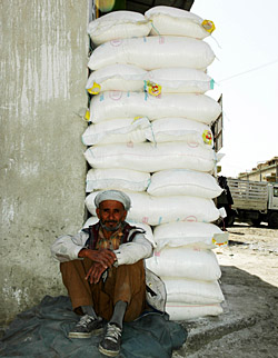 | 7月6日,一名搬運工在阿富汗首都喀布爾的一個面粉市場里休息。在全球糧食價格飆升的背景下,阿富汗人的主食面粉的價格也較去年大漲,使很多普通阿富汗人的生活更加艱辛。新華社記者