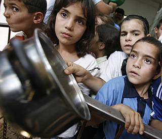 | 圖為貧困的巴勒斯坦兒童在希伯倫排隊等候發放免費的開齋飯。新華社發 | 本報訊