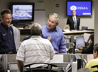 | 8月31日,美國總統布什(右)在位于首都華盛頓的聯邦緊急措施署總部和工作人員交談。新華社/路透 | 襲擊墨西哥灣的颶風“古斯塔夫”于當地時間9月1日早登陸美國,美國石油產業的損失備受關注,而其他行業也岌岌可危。其中,新奧爾良的支柱產業如旅游、船運和產糖業都受到巨大威脅,可能出現數十億美元經濟損失。 美國總統布什已提前宣布路易斯安那、得克薩斯、密西西比和亞拉巴馬4個州進入緊急狀態。