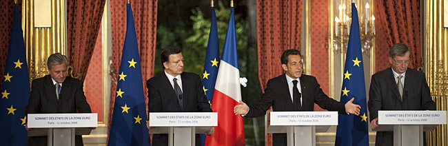 | 圖為12日,在法國首都巴黎,(從左至右)歐洲中央銀行行長特里謝、歐盟委員會主席巴羅佐、歐盟輪值主席國法國總統薩科齊和歐元集團主席、盧森堡首相容克出席聯合新聞發布會。歐元區15國領導人當天在巴黎召開的首腦會議上通過一項行動計劃,同意由各國政府為銀行再融資提供擔保并向銀行注資,以共同應對當前的金融危機。新華社/路透 |