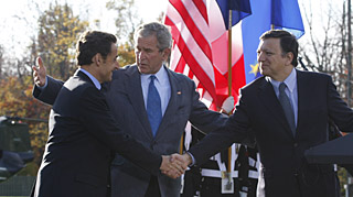 | 圖為18日,在美國馬里蘭州戴維營,美國總統布什(中)歡迎到訪的法國總統薩科齊(左)和歐盟委員會主席巴羅佐。布什當天宣布,美國將于近期就國際金融危機問題主持召開一次國際峰會。新華社/法新 | 在法國總統尼古拉·薩科齊等歐洲領導人積極游說下,美國總統喬治·W·布什18日宣布將出面召集各國領導人,舉行全球峰會應對金融危機。 聯合國秘書長潘基文說,希望擬議中的全球金融峰會在紐約聯合國總部舉行,以體現全球齊心抵御金融危機的集體意志和多邊主義色彩。 薩科齊和歐洲聯盟委員會主席若澤·曼努埃爾·巴羅佐18日前往位于馬里蘭州的美國總統度假地戴維營,與布什總統舉行大約3小時會談。 薩科齊和巴羅佐此行目的之一是說服布什出面召集一個全球峰會,以加強各國在眼下全球金融危機中的合作和互助,避免全球金融市場繼續動蕩。 路透社之前援引美國一名政府高官的話報道說,布什將在與薩科齊等人會談后宣布將主持全球金融峰會。 不過,布什在會談開始前即宣布愿意出面召集金融峰會。 “有必要攜手工作,因為我們共處這場危機中,”布什說,“我期待在不久的將來主持這個峰會!彼麤]有提及峰會具體日程。 薩科齊是全球峰會的積極倡議者。 金融危機愈演愈烈之際,他呼吁八國集團領導人和其他新興經濟體領導人在今年年底前舉行全球峰會,聯手應對危機,探討建立國際金融新秩序。這一呼吁得到英國首相戈登·布朗、德國總理安格拉·默克爾的響應。 薩科齊17日重申重建國際金融體系的重要性。他在加拿大魁北克市出席第12屆法語國家首腦會議時說:“我們需要攜手重建資本主義,更加以人為本,更加尊重地球,更加尊重年輕一代! 他說,瘋狂尋求短期利潤的現有資本主義模式應該“終結”。 薩科齊當天在戴維營再次批判釀成眼下危機的資本主義模式,稱“這類資本主義是對我們信仰的資本主義的背叛”! 布什似乎對薩科齊借峰會“修正”資本主義的傾向有所警惕。他強調,峰會不應尋求削弱全球自由市場的基本經濟原則,“我們必須抗拒經濟孤立的危險誘惑,繼續市場開放政策”。 聯合國秘書長潘基文18日致信薩科齊,稱聯合國方面全力支持今年12月初召集全球金融峰會的設想,愿意提供聯合國總部為峰會會場。 “我們一致同意,現在時間緊迫,我完全認同您關于12月初盡早召集這么一個論壇的主張,”潘基文在魁北克會晤薩科齊后發表一封公開信說,“在這個問題上,我非常愿意提供位于紐約的聯合國辦公大樓! 潘基文說,把峰會會場放在聯合國總部有特殊意義,因為聯合國是“多邊主義”的象征,“將給這次努力帶來廣泛合法性,同時彰顯愿意面對這場全球性嚴重挑戰的集體意志”。 白宮一名發言人18日說,布什與薩科齊等人的戴維營會談不會設定全球峰會的時間和地點,也不會宣布新的政策。 (新華社專稿) |
