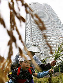 | 圖為2006年9月30日,在日本首都東京市中心的一處屋頂稻田,一位小學生在農民的幫助下收割稻米。新華社發 | 在日本東京鬧市區的高層樓樓頂和地下室里,一壟壟新鮮蔬菜水果讓人誤以為置身在田間地頭。其實,這是“城市農民”的杰作。這一新興職業讓年輕人在大都市實現夢想。