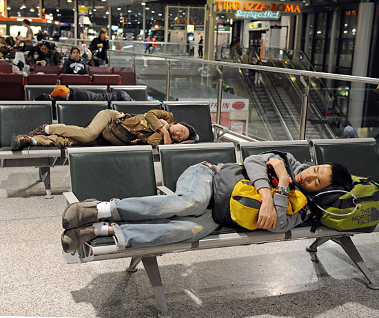 10日,一些旅客在意大利首都羅馬的菲烏米奇諾國際機場候機大廳里睡覺。當天,意大利航空公司空乘人員舉行24小時罷工,導致菲烏米奇諾國際機場近100個航班被取消或延誤,一些旅客被迫滯留機場。新華社/法新