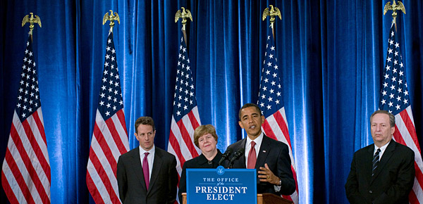 | 上圖為24日,美國當選總統奧巴馬(右二)在芝加哥舉行的新聞發布會上正式宣布,提名蒂莫西·蓋特納(左一)出任新政府財政部長;提名勞倫斯·薩默斯(右一)為國家經濟委員會主任;提名克里斯蒂娜·羅默(左二)為白宮經濟顧問委員會主任。新華社/法新 |