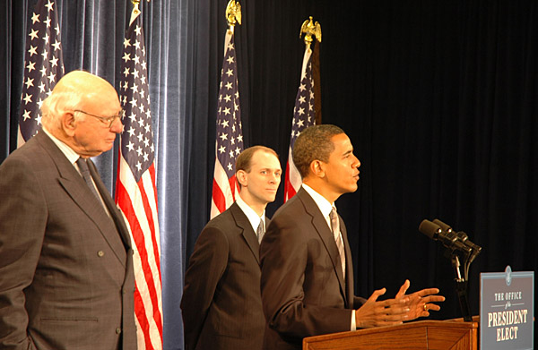 | 26日,美國當選總統奧巴馬(右)在芝加哥召開的新聞發布會上講話。奧巴馬當日宣布,將成立一個經濟復蘇顧問委員會,并提名美國聯邦儲備委員會前主席保羅·沃爾克(左)來領導這一新的經濟團隊。新華社記者