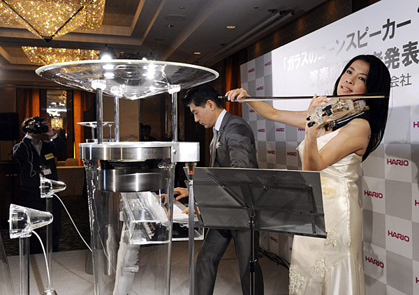 27日,在日本東京舉辦的玻璃制音響系統展示會上,小提琴手和鍵盤手演奏用玻璃制作的樂器。當日,名為“Hario”的玻璃制音響系統在東京展示。這套包括一個低音、兩個中音和兩個高音揚聲器的音響系統是用超薄防熱玻璃制作而成的,售價超過10萬美元。新華社/法新