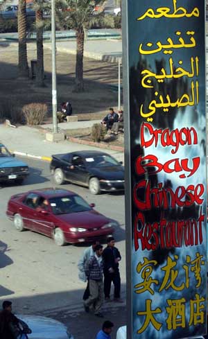 該圖為2003年12月31日開業的宴龍灣大酒店的標牌。建立在巴格達市中心的該酒店是伊拉克戰后首家中國人投資的中餐飯店。新華社記者:黃敬文