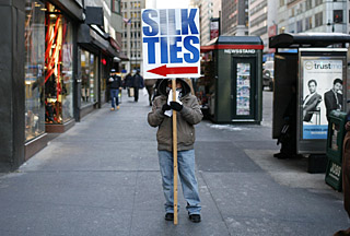 | 23日,一名男子在美國紐約市的街頭手持銷售領帶的標牌。美國市場調查公司ShopperTrak RCT公司24日發表統計數據顯示,美國零售商店今年圣誕節前周末客流量較去年同期下滑24%,今年年底可能是40年來最暗淡的一個銷售季。新華社/路透 | 24日平安夜,各處商家店鋪提早關門,今年的圣誕節購物季也宣告結束。在金融危機的沖擊下,美國人的圣誕消費悄然發生變化——紛紛過起了“緊日子”,更加精打細算,盡量減少購物預算。零售商的日子不太好過。不過有分析家預測今年的節后銷售要熱過往年。