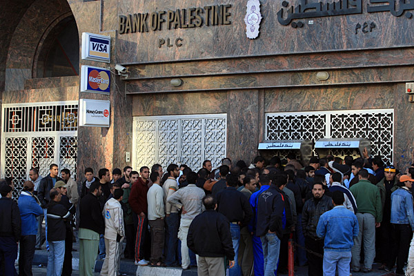 13日,巴勒斯坦人在加沙城內的一家巴勒斯坦銀行排隊取款。這是這家銀行自去年12月27日以色列采取軍事行動以來首次營業。