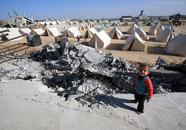 1月31日,在加沙地帶北部的賈巴利亞,一名兒童站在一個由帳篷組成的臨時居民點外。以軍持續22天的“鑄鉛行動”導致加沙地帶大量建筑被損毀,而;鹬笠陨袑由车某掷m封鎖以及巴勒斯坦內部對接受國際援助問題的分歧使得加沙重建工作進展緩慢。