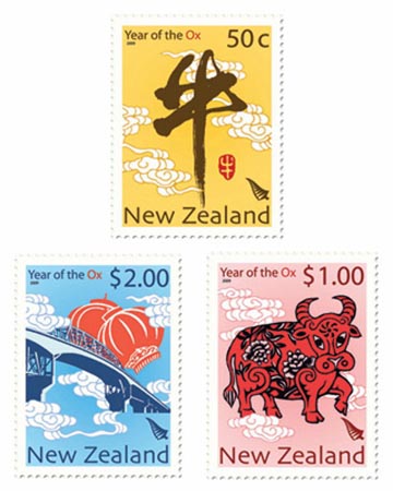 本報訊 為慶祝中國農歷牛年來臨,新西蘭郵政局日前發行了一套牛年生肖郵票。 該套郵票蘊涵了中國書法、線描藝術元素,并結合了新西蘭本地的多元文化背景。新西蘭郵政局此次共發行3枚郵票,一枚小型張和2枚首日封。其中兩元面值的郵票圖案為紅燈籠和奧克蘭海港大橋,以慶祝奧克蘭的中國元宵節燈會;一元面值的郵票圖案是一頭色彩鮮艷、富有現代氣息的牛;五角面值的郵票則書有一個大大的漢字。