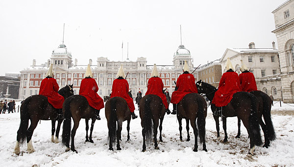 2日,在英國倫敦,英國皇家騎兵團成員在風雪中佇立。行業協會3日公布的一份調查數據顯示,1日晚起出現的連續降雪給英國造成的經濟損失可能超過10億美元。如果降雪持續,這一數字可能繼續上升,使本已陷入衰退的英國經濟雪上加霜。新華社/路透