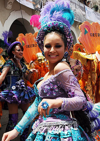 21日,在玻利維亞西南部奧魯羅省首府奧魯羅市街頭,姑娘們身著艷麗服裝參加狂歡節表演。著名的玻利維亞奧魯羅狂歡節是南美地區最具特色的狂歡節之一,每年都吸引數十萬人前來觀看。新華社發