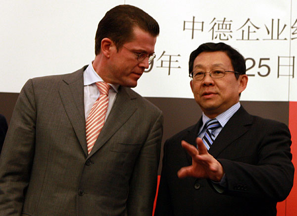 25日,中國商務部長陳德銘(右)和德國經濟部長古滕貝格在柏林德國工業聯合會總部舉行的“中德貿易投資論壇暨采購項目簽約儀式”上交談。當日,陳德銘率中國貿易投資促進團訪問德國。陳德銘和古滕貝格共同出席了“中德貿易投資論壇暨采購項目簽約儀式”,并分別發表演講。