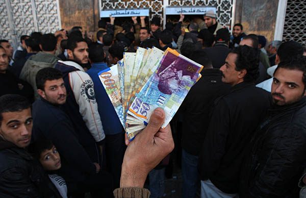 15日,在加沙地帶,一名巴勒斯坦民族權力機構工作人員排隊等候從銀行自動柜員機提取工資時展示幾張鈔票。當天,當地大約7萬名巴民族權力機構工作人員領取到了遲發兩周的二月份工資。之前以色列阻止巴民族權力機構主席阿巴斯領導的政府向加沙地帶匯錢。