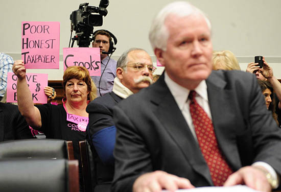 | 圖為18日AIG首席執行官愛德華·利迪(前)在美國國會山出席國會眾議院金融委員會舉行的聽證會,抗議者在其身后高舉標語。