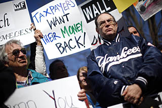 | 21日,在美國康涅狄格州美國國際集團(AIG)總部外,抗議者手舉“納稅人想要回他們的錢”等牌板。當天,康涅狄格州一個勞工團體組織金融危機受害者前往AIG總部,抗議AIG在接受美國政府巨額資金援助的情況下仍向部分高管和員工發放高額獎金。新華社/路透 | 美國康涅狄格州總檢察長理查德·布盧門塔爾21日說,保險業巨頭美國國際集團(AIG)提交文件顯示,公司前一周(指9日至15日)共發放2.18億美元獎金,比先前公布數額多5300萬美元。他要求公司作出解釋。 AIG發放巨額獎金一事引發眾怒,美國19州宣布展開聯合調查。但白宮發言人說,總統貝拉克·奧巴馬可能會在獎金征收重稅問題上態度有所緩和,以確保相關公司不會退出政府金融業救助計劃。