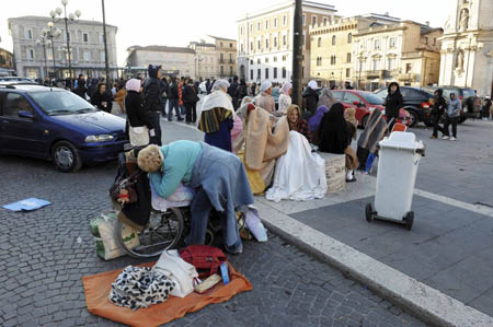 6日,在意大利中部拉奎拉省,一些當地居民披著毯子在廣場上躲避可能來臨的余震。意大利中部地區6日凌晨發生強烈地震,造成重大人員傷亡和財產損失。