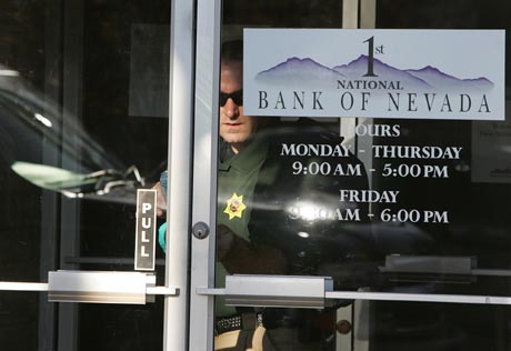 2008年7月25日,美國內華達州第一國民銀行破產停業,一名調查人員鎖上大門。新華社/美聯 |