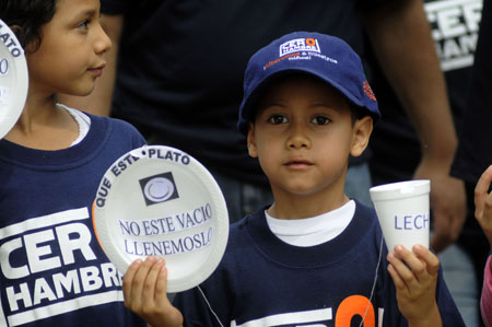 6月7日,在洪都拉斯首都特古西加爾巴,人們參加“零饑餓”大游行。當天,特古西加爾巴市市民以“零饑餓”為主題進行大規模游行,呼吁社會為消除饑餓和營養不良做出貢獻。據悉,由于國內糧食產量的持續下滑和中美洲糧食緊缺局面的加劇,目前洪都拉斯國內34座城市出現糧食供應問題,約有30萬名年齡在5歲以下的兒童營養不良,其中20萬營養不良兒童集中在相對貧瘠的洪都拉南部。目前,洪都拉斯政府正在尋求聯合國和中美洲鄰國的幫助,以求緩解國內日益嚴重的糧食危機。