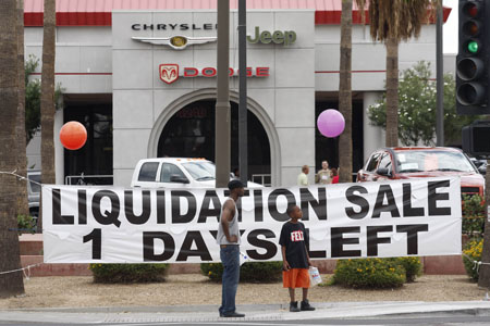 9日,美國亞利桑那州菲尼克斯市的一家克萊斯勒經銷商辦事處外打出“清算銷售僅剩一天”的橫幅。新華社/路透 |