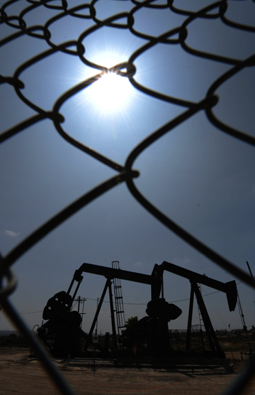 圖為2009年5月12日在美國洛杉磯一個油田拍攝的工作中的機泵。新華社/法新 |