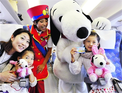 26日,在從日本東京開往大阪的新干線列車上,裝扮成迪斯尼經典卡通形象史努比的工作人員與小朋友玩耍。為推廣位于大阪的日本環球影城,卡通形象“史努比”即日起登上新干線列車,陪伴乘客度過旅途時光。新華社/法新