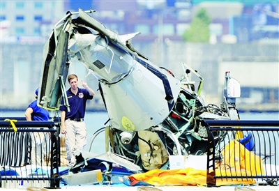 11日,工作人員在美國紐約哈得孫河查看打撈上來的失事直升機殘骸。一架小型私人飛機和一架觀光直升機8日在哈得孫河上空相撞墜河,致使9人死亡。新華社/路透