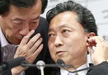 30日,日本最大在野黨民主黨黨首鳩山由紀夫(右)在眾議院大選開票現場。新華社記者:任正來