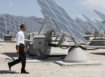 美國總統奧巴馬提出的經濟刺激計劃中,首要的就是發展可再生能源。5月27日,美國總統奧巴馬在拉斯韋加斯的內利斯空軍基地視察太陽能電池板。新華社/路透