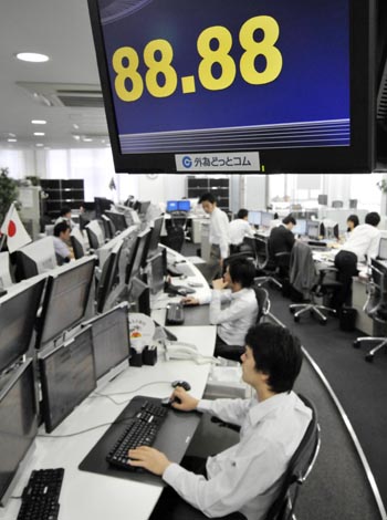 28日,一名交易員在東京外匯交易市場的外匯電子牌價下工作。(資料照片) | 28日東京外匯市場,日元對美元匯率沖破90比1的關口,一度升至88.23比1的附近,創下自今年1月23日之后約8個月的盤中新高。在不到一個半月的時間里升值近10日元,從8月上半月時的97升至目前的水平。 為此,日本財務大臣藤井裕久29日上午對新聞界說,近日東京外匯市場上日元對美元升值速度“稍微有些快”,如果日元匯率發生“急劇變動”,政府必須考慮采取對策。 藤井裕久認為,日元匯率變動的主要原因在于美國經濟形勢。他表示,如果發生“異常事態”,將存在各種可能性。這一表態顯示日本政府在是否干預市場政策上有所調整。上周,藤井曾暗示政府不打算干預市場。 29日東京時間上午10時,東京外匯市場上日元對美元匯率回落至90.2比1水平。市場人士指出,一些機構投資者開始購買美元,從而遏制了日元快速升值的勢頭。