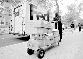 9月17日,美國聯邦快遞公司一名員工在華盛頓遞送快件。聯邦快遞公司當天發布的報告稱,受國際金融危機的影響,該公司的季度利潤下滑53%。新華社/路透 |