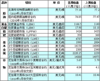國際貨幣基金組織(IMF)25日宣布向斯里蘭卡央行出售了10噸黃金,該消息刺激倫敦市場黃金期貨價格次日上沖至每盎司1195.13美元的歷史新高,逼近1200美元關口。據傳,印度正考慮向IMF增購黃金。分析人士認為,由于目前各國央行尋求外匯儲備多元化的意愿仍很強,可能會購買更多黃金,因此12月的金價可能繼續上升。美國費爾法克斯公司分析師約翰·邁耶說,央行及其他投資者需求可能推動金價在未來3到6個月漲至每盎司1500美元。 受美元匯率波動等因素影響,當周國際油價震蕩走低。尤其是受迪拜世界公司巨額債務違約的消息拖累,27日紐約市場油價一度跌至每桶72.39美元的低位,跌幅超過7%。俄羅斯副總理兼財政部長庫德林25日說,美元走軟推動了石油價格上漲,最近油價仍有望保持每桶70美元至80美元的水平,并在短期內可能出現進一步上漲,但隨后兩年間將可能出現下跌。 庫存大增打壓倫敦市場基本金屬價格。本周倫敦金屬交易所(LME)的鎳庫存增加了2000噸,至13.5萬噸,為1995年1月以來的最高水平。巴克萊資本公司的研究報告指出,目前所有LME的金屬庫存水準均高于其10月底水平。 當周芝加哥期貨交易所農產品期貨價格小幅下跌。除受外部市場因素影響外,玉米、大豆預期收割進度加快也為市場帶來壓力。美國農業部公布的報告顯示,截至11月22日的一周,美國玉米收割已經完成68%,比前一周提高了14個百分點;大豆收割已經完成94%。美國小麥遭國際買家冷落,也進一步增添了小麥市場的做空氣氛。