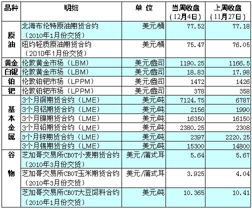 繼1日突破新“天花板”——每盎司1200美元大關后,倫敦市場金價3日再創新高,盤中升至1226.56美元。 在美元疲軟、通脹擔憂增加和各國央行普遍增加黃金儲備的背景下,國際金價近期節節攀升、連創新高。分析人士認為,從目前看來,國際金價中期上行的動力依然存在,短期回調不足以影響總體走強格局。高盛當周發布報告,將其對未來12個月的金價預測值提高至每盎司1350美元,并預計明年黃金均價為1265美元! 〗饍r持續攀升拉動其他貴金屬價格走高。當周,倫敦市場白銀期貨價創下16個月來新高,達到每盎司19.46美元,鉑和鈀的期貨價分別創下15個月和16個月新高。 受到美國商業能源庫存高企、需求不振等因素的壓制,當周國際油價在前兩個交易日小幅上漲后持續下跌。此外,根據美國勞工部公布的最新就業報告,11月份美國失業率意外下降至10%,顯示經濟出現實質性好轉。然而,由于投資者擔心經濟的好轉會促使美聯儲提前加息,美元隨即受到追捧,從而拖累油價最終走低。因美國和中國制造業數據表現強勁,同時美元疲軟吸引了更多的投資資金進入市場,倫敦市場銅期貨價當周大幅上漲,2日盤中攀升至每噸7170美元,為去年9月以來最高。 其他基本金屬期貨價格也呈現不同程度漲幅,分析人士認為,這主要是因為全球宏觀經濟形勢基本面向好,對金屬的需求總體看漲。數據顯示,美國11月份失業人口只增加1.1萬,是本次危機開始以來表現最好的月份。另外,投資者相信經濟合作與發展組織成員(OECD)對金屬的需求將會反彈,從而支撐金屬價格的上漲勢頭。 在基本面消息乏善可陳的情況下,外部市場主導了芝加哥市場農產品期貨的價格走勢。當周美元匯率的大幅上漲壓低了國際買家對美國農產品的興趣,大豆、玉米和小麥的期貨價均較上周有所回落。
