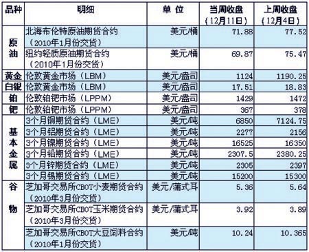 受投資者擔心能源需求疲軟和美元持續走強等因素的影響,當周國際油價連續5個交易日出現下滑,并且紐約市場油價跌破了每桶70美元的關口。美聯儲主席伯南克在華盛頓經濟俱樂部發表演講時表示,美國經濟目前還面臨著就業市場不振、居民消費意愿不高和信貸市場緊縮等一系列問題,現在斷言復蘇是否能夠持續還為時過早。他的這一表態加重了市場投資者對原油需求恢復前景的憂慮,打壓油價走低。另外由于美元走強,以美元計價的油價出現回落。 當周國際金價連續大幅下跌,比月初創下的最高歷史紀錄已下挫逾100美元,這主要是因為近期美元的上漲,壓低了投資者買入黃金保值的需求。分析人士指出,現階段關于是否會爆發債務危機的擔憂情緒正在蔓延,在市場沒有明朗化之前,金價仍有下跌的可能。 倫敦金屬交易所(LME)的鋁庫存持續下降,因此鋁價升至2008年10月份以來的最高水平——每噸2277美元。其他基本金屬的價格則普遍下跌,但有分析人士認為,長遠來看,當前基本金屬價格回調,僅屬上漲趨勢中的暫時回調,大方向上仍具備較大上漲空間。 分析人士指出,當周能源、金屬和農作物的價格調整是必要的,因為自9月底以來,這些商品的價格在幾無中斷的情況下連續上揚,商品價格的跌勢或將延續至年末,因為市場對表明需求遲滯的原材料庫存高筑現象做出反應,而交易商則趕在年底前軋平倉位。若明年以后出現力道特別大的經濟復蘇,尤其在新興市場,將可能促使原材料需求激增。