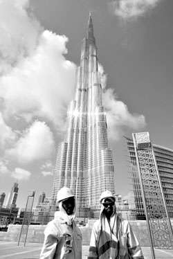 11月,迪拜世界公司出現大規模債務違約,引起國際金融市場連鎖反應。12月14日,兩名外籍勞工在阿聯酋迪拜塔邊的工地上休息。新華社發 |