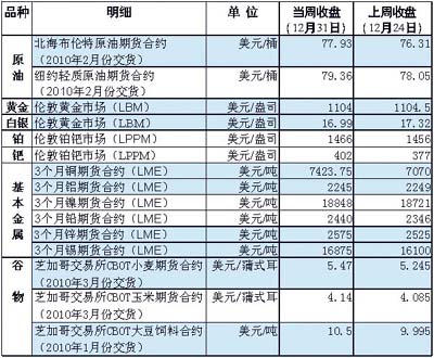 2009年最后一周,國際大宗商品價格多數上漲。 由于寒冷天氣拉動燃油消費,加之美國原油庫存已連續四周下降,餾分油庫存連續三周下降,推動當周原油價格連續四個交易日上漲。此外,受美國首次申請失業救濟人數下滑等因素影響,紐約市場油價一度漲至每桶80美元。與2008年年終收盤相比,國際油價2009年的漲幅超過70%,為過去10年中漲幅最大的一年。世界經濟復蘇狀況及國際貨幣匯率的變化是引發油價波動的主要因素。 市場預期,隨著世界經濟進一步回升,能源市場的供求狀況將隨之改變,國際油價也將在2010年繼續走強。 當周國際金價震蕩收平,受美元指數波動影響,四個交易日里漲跌各半,收盤價仍維持在每盎司1100美元附近。 受智利銅礦工人罷工事件影響,倫敦金屬交易所(LME)3個月期銅價格在2009年最后一周升至15個月來高點。全球基本金屬價格2009年普遍上漲,其中銅價漲勢最為迅猛。LME期銅價格從2008年12月的每噸2825美元一路飆升至2009年年底的每噸7400美元上方,全年漲幅超過160%。 由于LME超過46萬噸的鋁庫存仍處于歷史高位,對鋁價起到抑制作用,使當周鋁價小幅下跌。在宏觀經濟數據改善的大背景下,德國財長施泰因布呂克日前呼吁二十國集團成員協調經濟刺激計劃的退出機制,市場擔心這會對金屬需求的前景產生影響。