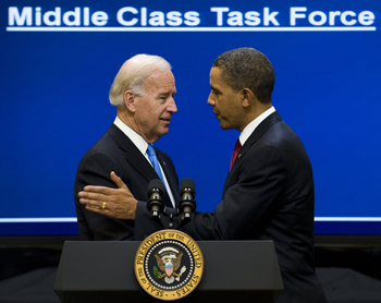 1月25日,美國總統奧巴馬(右)和副總統拜登在白宮出席中產階級家庭工作組會議。新華社/法新 |