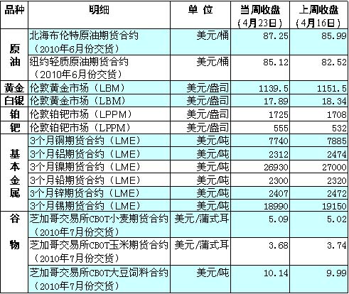)原油期貨價格當周初出現較大幅度回調,周二(20日)受冰島火山灰影響各大航空公司紛紛取消航班,對需求的擔憂使得原油跌幅進一步擴大。周三(21日)商業庫存意外大幅上升也給原油價格構成壓力。而美國新房銷售數據上升,提振了經濟復蘇的樂觀情緒,令國際油價周五(23日)全面走高,紐約市場油價收于每桶85.12美元。 貴金屬方面,當周鈀價創兩年來最高水平。巴克萊資本分析師庫珀認為,這主要是“由于投資創新紀錄以及中國進口強勁”。由于高盛被訴,導致美元走軟,國際金價當周未能繼續上漲,周五,倫敦黃金市場金價跌至每盎司1139.5美元。 基本金屬當周全線走跌。倫敦基本金屬價格多數小幅下挫,顯示市場還沒有完全從高盛事件中恢復過來。 受天氣因素以及投資者獲利了結的影響,芝加哥期貨交易所(CBO