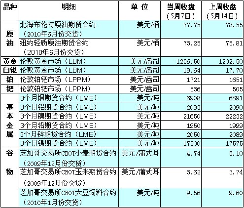 盡管上周初歐盟成員國財長推出了高達7500億歐元的龐大救助機制,防止希臘債務危機進一步蔓延,但市場投資者仍擔心西班牙、葡萄牙等國將步希臘后塵,最終拖累全球經濟復蘇步伐。避險情緒推動全球資金轉投黃金市場,當周國際金價因此再度走高。 號稱史上規模最大的救助機制并未成功消除市場對歐元區債務危機再度升級的擔憂。市場目前將更多注意力集中在幾個債務嚴重的國家身上:西班牙、葡萄牙兩國政府相繼宣布采取緊縮的財政政策以抑制財政赤字,希臘國內罷工仍在繼續,歐元區未來將面臨分裂的可能性正在加大,此類負面消息令投資者感到沮喪。市場分析人士認為,只要歐元區債務危機無法解除警報,作為“避險天堂”的黃金就會繼續受到追捧,目前來看,今年二季度國際金價攀上1300美元/盎司已無阻力可言。在金價提振之下,銀價當周走高,升至近兩年來高點。 受市場擔心歐元區債務危機蔓延,美元匯率繼續走向以及美國商業原油庫存增加等因素影響,國際油價當周下跌。美國能源部13日公布的數據顯示,此前一周美國原油商業庫存增加了190萬桶,比此前市場分析師預期值高出一倍以上。此外,總部位于巴黎的國際能源機構也削減了其對全球能源需求的預估數據。國際能源機構預測,今年全球原油需求為每日8640萬桶,將比去年高出1.9%,但這一數字比該組織上次公布的預測值要低22萬桶/日。國際能源機構認為,在主權債務危機的影響下,全球經濟復蘇正面臨著日益增加的風險,這將對全球能源需求產生抑制作用。截至周五(14日),紐約市場上6月份交貨的輕質原油期貨價格降至每桶73.25美元,倫敦市場上6月份交貨的北海布倫特原油期價以每桶77.75美元報收。 此外,當周倫敦金屬市場上,基本金屬價格跌多漲少,比較顯著的是,3個月的銅期價漲至每噸6908美元。 芝加哥交易所中,主要農產品期貨價格當周下挫。一方面,歐元匯率下跌提升了歐洲農產品在國際市場中的競爭優勢,對美國小麥出口不利;另一方面,近期美國主要糧食產區氣候條件適宜農產品生長,豐收預期得到強化,因此對農產品期貨價格構成一定壓力。