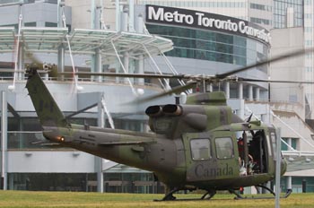 在加拿大城市多倫多,一架軍用直升機在G20峰會會場附近草坪上等待執行巡邏任務。新華社發(鄒崢 攝)