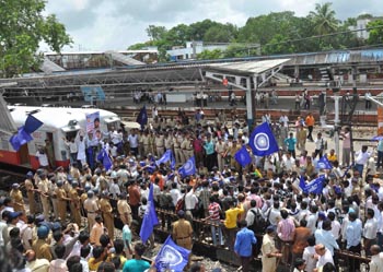 印度全國罷工抗議油價上漲。7月5日,示威者在印度孟買一處火車站舉行抗議。新華社/路透 |