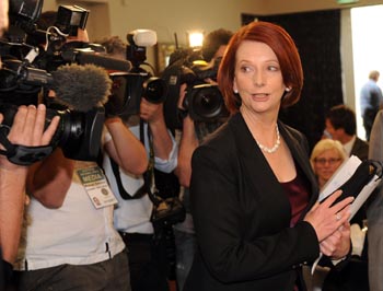 19日,在距澳大利亞聯邦大選只剩兩天之際,澳現任總理、工黨候選人茱莉亞·吉拉德在堪培拉國家媒體俱樂部召開新聞發布會,就其競選政策及施政綱領發表競選前最后一次演講。(法新社) |